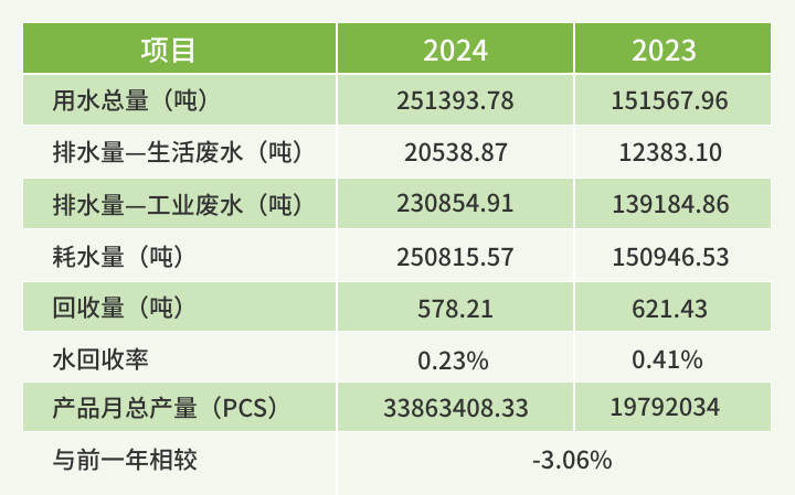 百钰顺集团产品制程多为组装,无大量用水需求,大部分用水需求为民生用水,以及部分厂务设备如厨房、冷却水塔等。经评估,集团主要用水来源皆为自来水,未使用雨水与地下水,且用水皆符合当地规范,取水量对于水源无重大影响。即便如此,百钰顺持续监控生产工厂的用水量,并致力减少用水量,百钰顺集团为加强水资源管理策略,制作各工厂用水平衡图,以协助强化我们的节约用水策略。